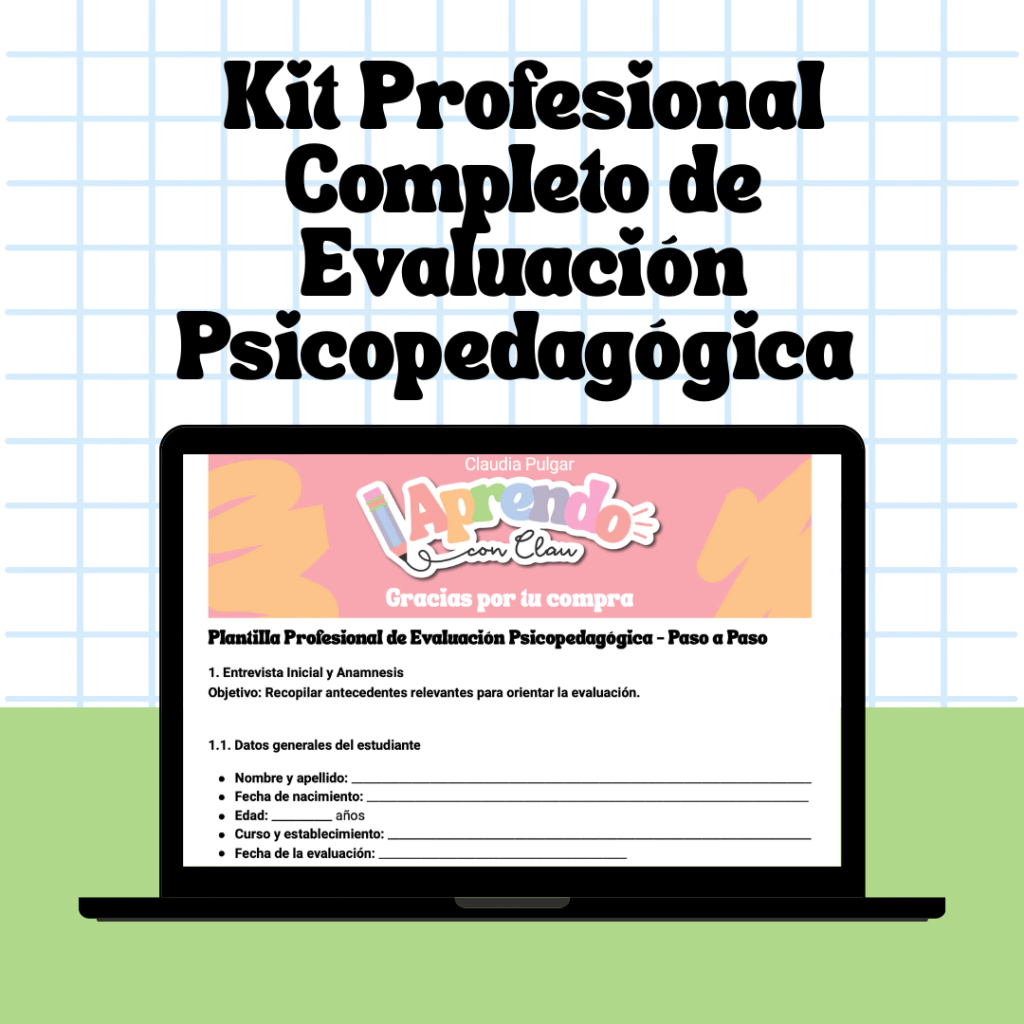 El Kit Profesional Completo de Evaluación Psicopedagógica es el aliado perfecto para psicopedagogos, educadores diferenciales, psicólogos y profesionales de la educación que buscan realizar evaluaciones con un enfoque claro, ordenado y profesional.